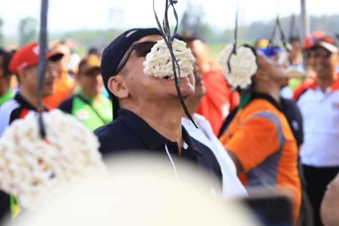 Antusias pesta semakin tinggi dengan melihat semangat para Pejabat dibawah Komando Sekdakab Tulangbawang Ir. Anthoni MM dan Forkopimda Plus yang mengikuti lomba makan kerupuk, lari karung dan lomba lainnya, sekaligus menanti pengundian kupon berhadiah peserta jalan sehat.(adv)