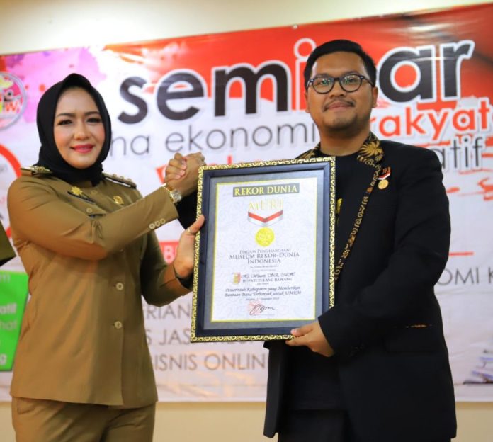 Program Kreatif Mandiri, Bergerak Melayani Warga (BMW) gagasan Bupati Tulangbawang, Hj. Winarti SE MH, meraih rekor muri dari Museum Rekor Dunia Indonesia (Muri) atas rekor “Pemerintah Kabupaten yang memberikan bantuan dana terbanyak untuk Usaha Mikro Kecil Menengah (UMKM).