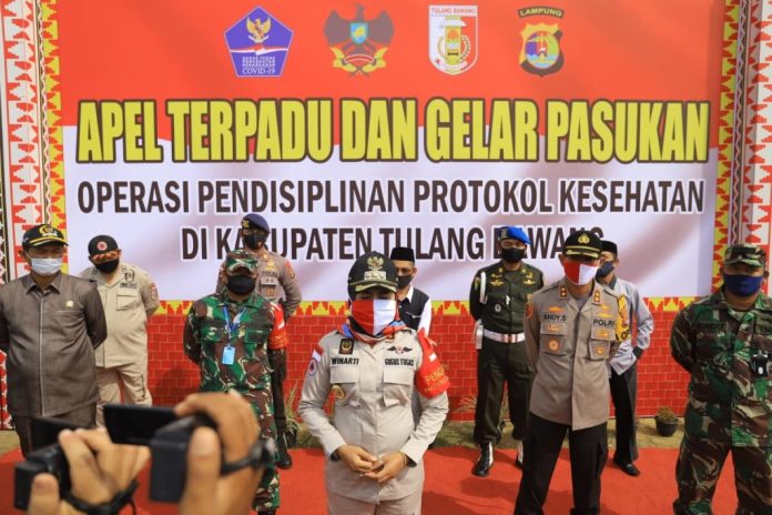 TULANG BAWANG - Bupati pimpin Apel besar bersama unsur Kodim 0426/Tuba, Polres Tuba , Kajari Tulang bawang, DPRD Tulang Bawang, Sat Pol PP, Dinkes , Fkppi dan RAPI Tulang bawang serta ormas lainya.