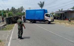 Dalam kecelakaan tunggal tersebut tidak ada korban jiwa hanya saja mobil nya menabrak pagar rumah warga hingga mengakibatkan mobil tersebut terbalik dan sekarang sudah ada bantuan dari warga setempat untuk menarik dan membalikan kembali mobil tersebut. mudah-mudahan usaha dari bantuan warga bisa membuahkan hasil. sehingga jalan tidak macet lagi dan bisa lancar kembali,” pungkasnya.